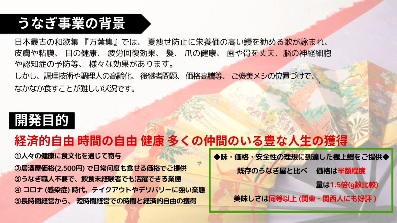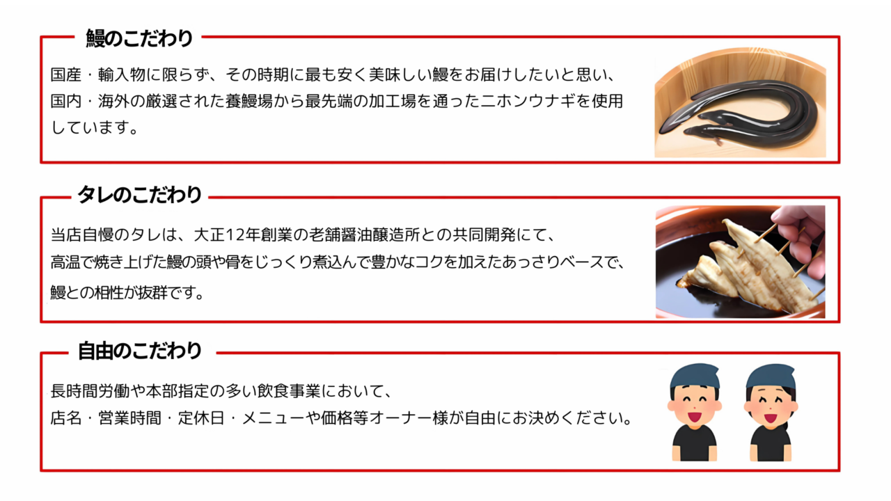 おいしいうなぎを通じて、お客様も自分自身も笑顔にする、「夢の実現と地域貢献を両立!うな匠のパートナーとして、みんなが幸せになる、うなぎ屋さんを開業しませんか?」