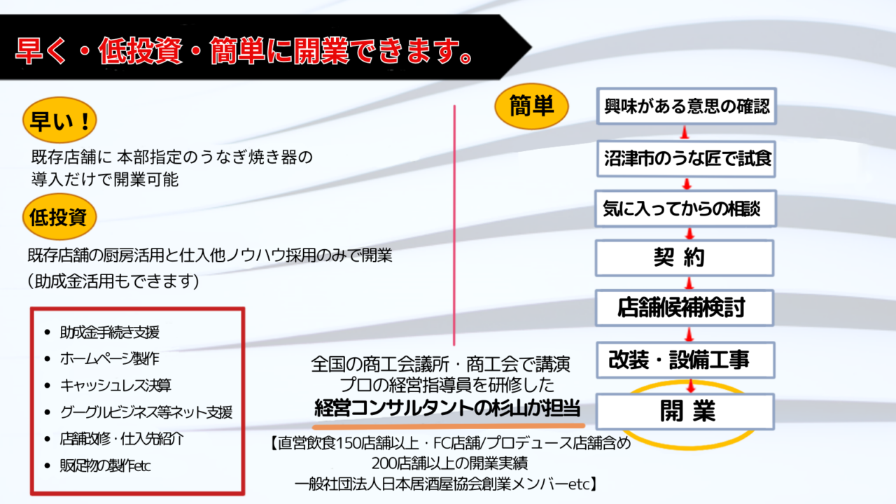 沼津 湧き水処うな匠を経営中の杉山春樹氏が、ずっとコンサルしてくれます。14社29業態の直営150店舗以上開業、FC出店、新規プロデュース含め200店舗以上の開業実績。こんな実績の持ち主は、そうそう居ません。
