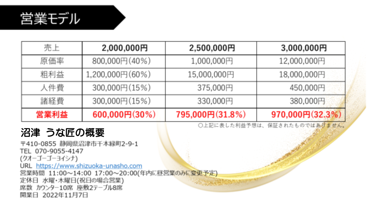 沼津 うな匠の実際の営業モデルを載せてみました。一例ですが、これくらいの儲けは期待できます。