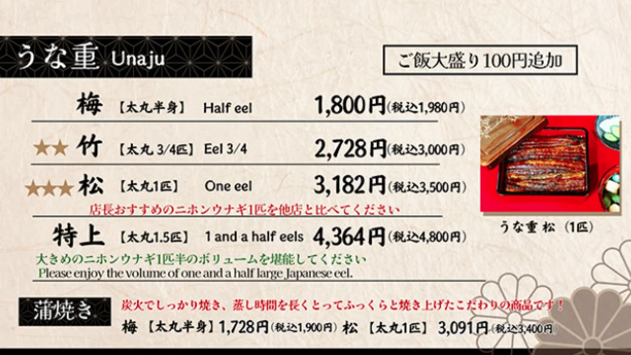 沼津 うな匠はこんな値段で提供しています!